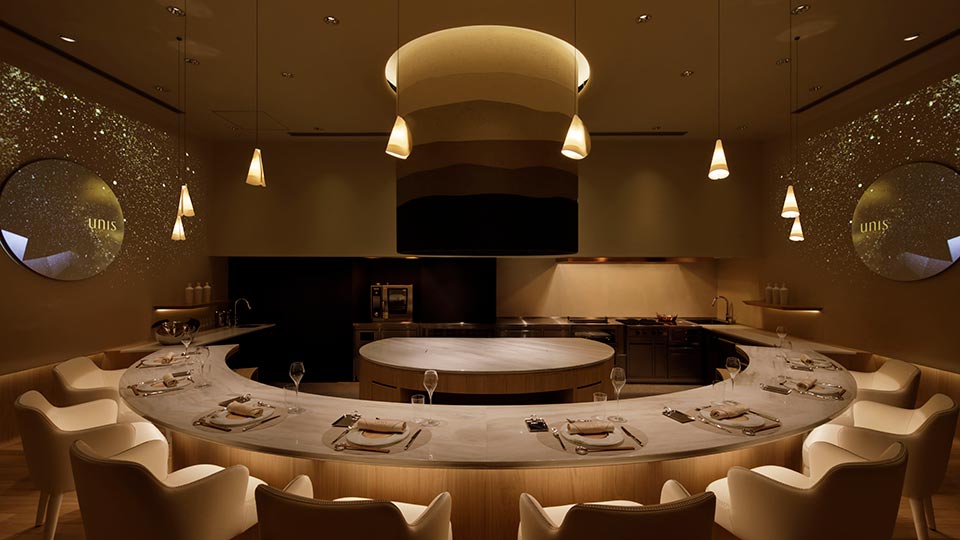 unisは、ハレの日をおもてなしする10席限定のシェフズテーブルです。お祝いの席を彩るレストランとして、シェフ薬師神 陸が今まで巡った全国600の生産者を繋ぐ料理・装飾・空間づくりだけでなく、音や光、映像演出をRhizomatiksと共創しお届けします。ドアを開けた瞬間からお食事後の余韻まで、五感全てで記憶するかけがえのない思い出となるよう、お客さまの大切な日を演出します。